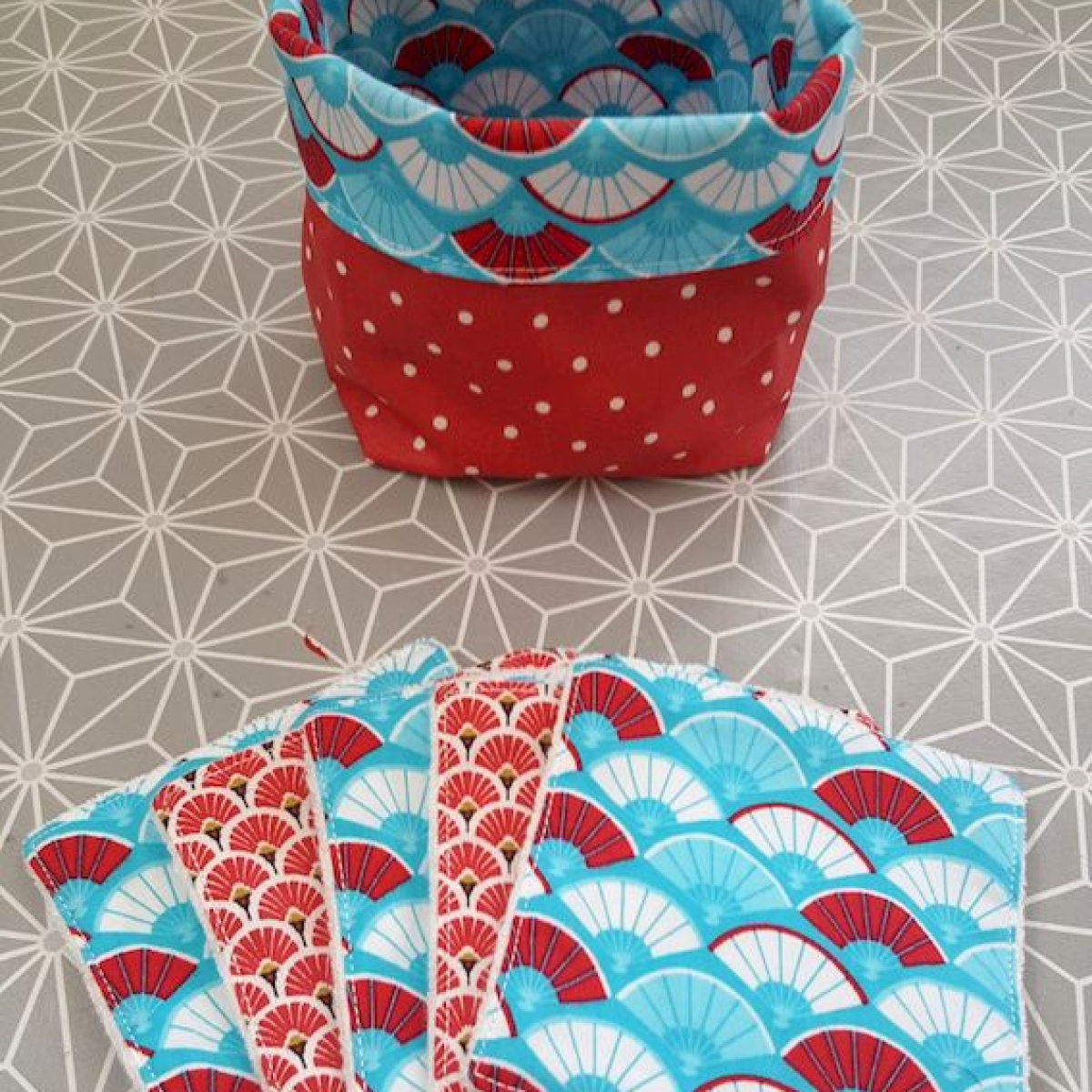 Petite corbeille en tissu avec 5 lingettes lavables en micro-éponges bambou sur une face et un tissu imprimé sur l'autre face.