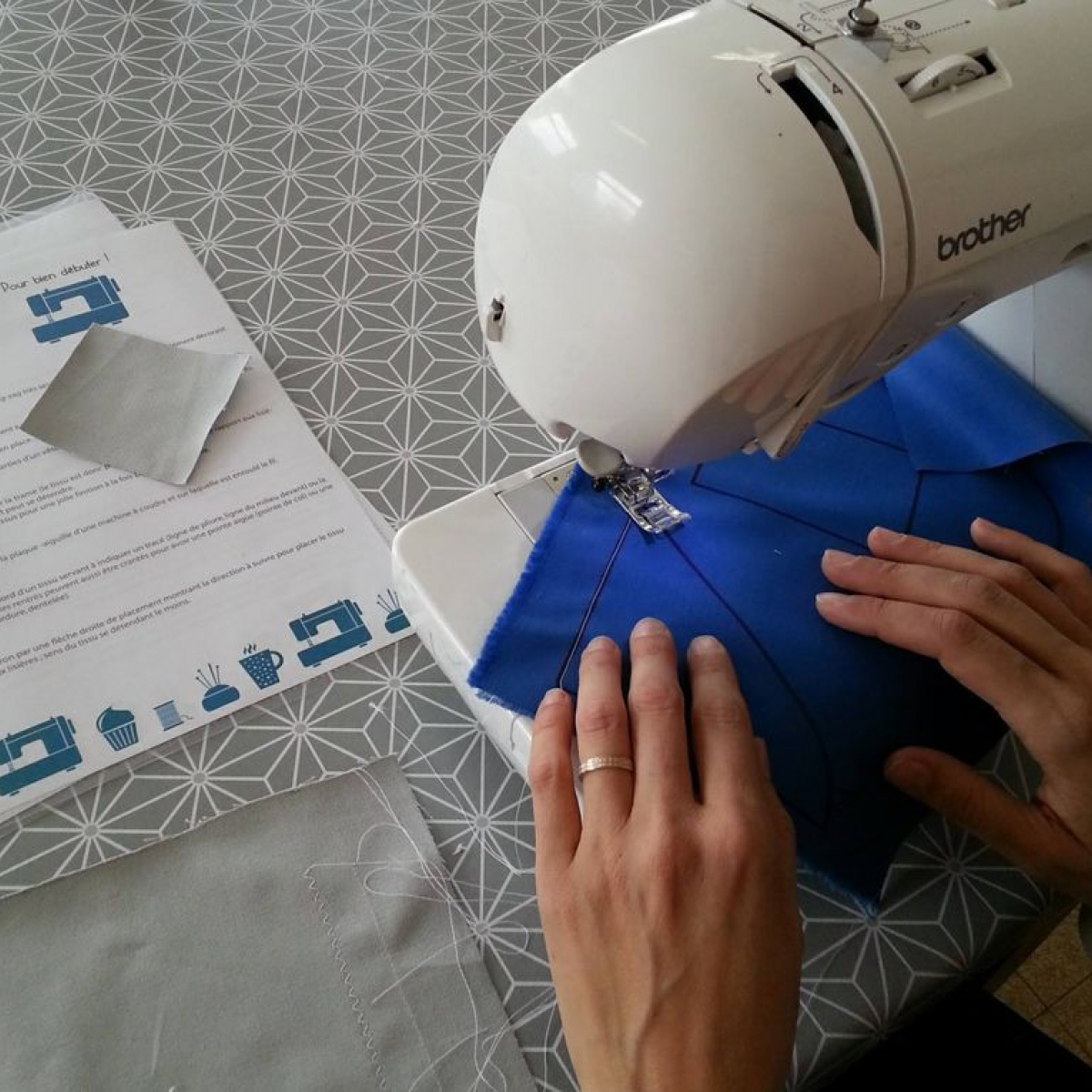 Prise en main de la machine à coudre avec réglages des points, de la tension du fil et exercices de couture